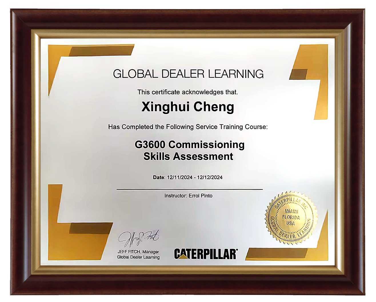 这 12 年,程兴会用拼搏与智慧浇灌出对卡特设备整体技术体系的深刻洞察与精准把握,最终,他的实力得到了权威认证,被光荣授予Cat®G3600燃气发动机调试认证大师证书。