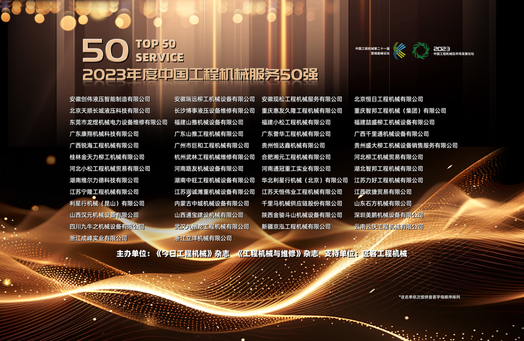 2023年10月18日,“2023年度中国工程机械年度服务50强”榜单在“亚运之城”杭州重磅发布。坚守工程机械服务价值,《今日工程机械》杂志、《工程机械与维修》杂志联袂推出“中国工程机械服务50强”评选。2023年度中国工程机械服务50强评选对象涵盖在中国工程机械市场上服务企业(包括代理商、技术服务商等),评选的核心标准为服务能力、服务质量和服务社会效益。金年会·jinnian(金子招牌)信誉至上机械集团喜获殊荣,再次入围中国工程机械年度服务50强。